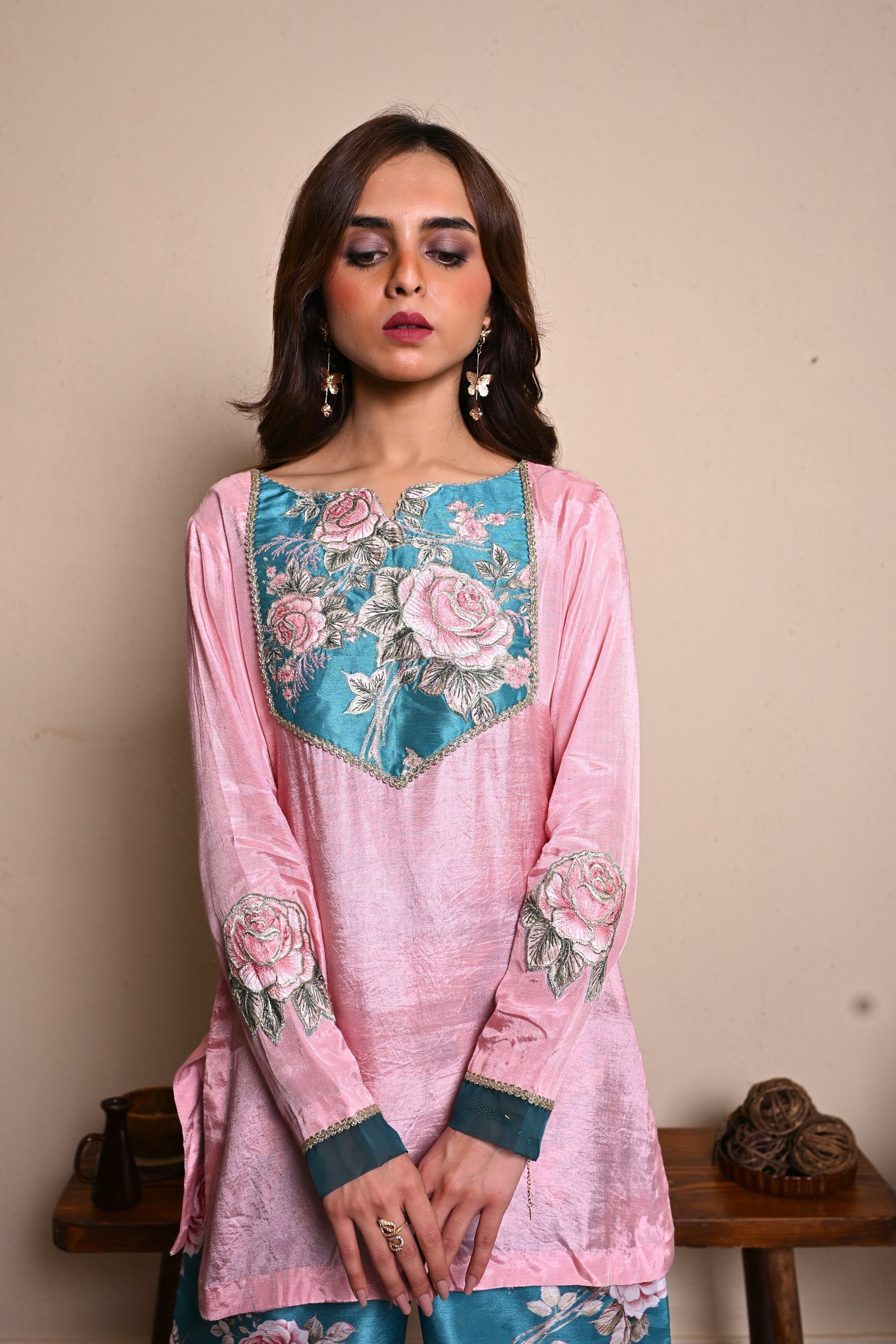 A straight-cut long shirt, detailed with intricate hand embroidery along the neckline and sleeves. It’s paired with a farshi shalwar, finished with decorative border detailing that adds structure to the silhouette. The look is completed with a dupatta featuring a four-sided border, bringing the ensemble together with balance and subtle refinement.